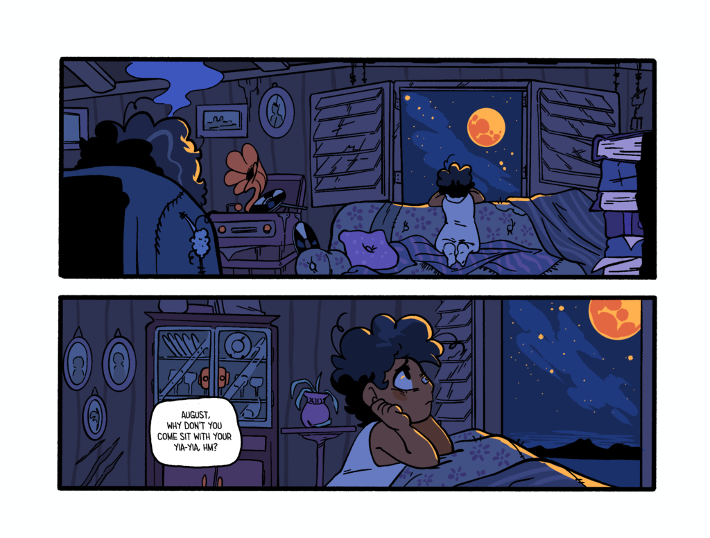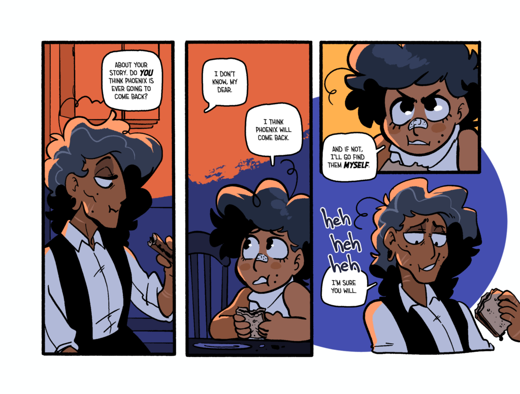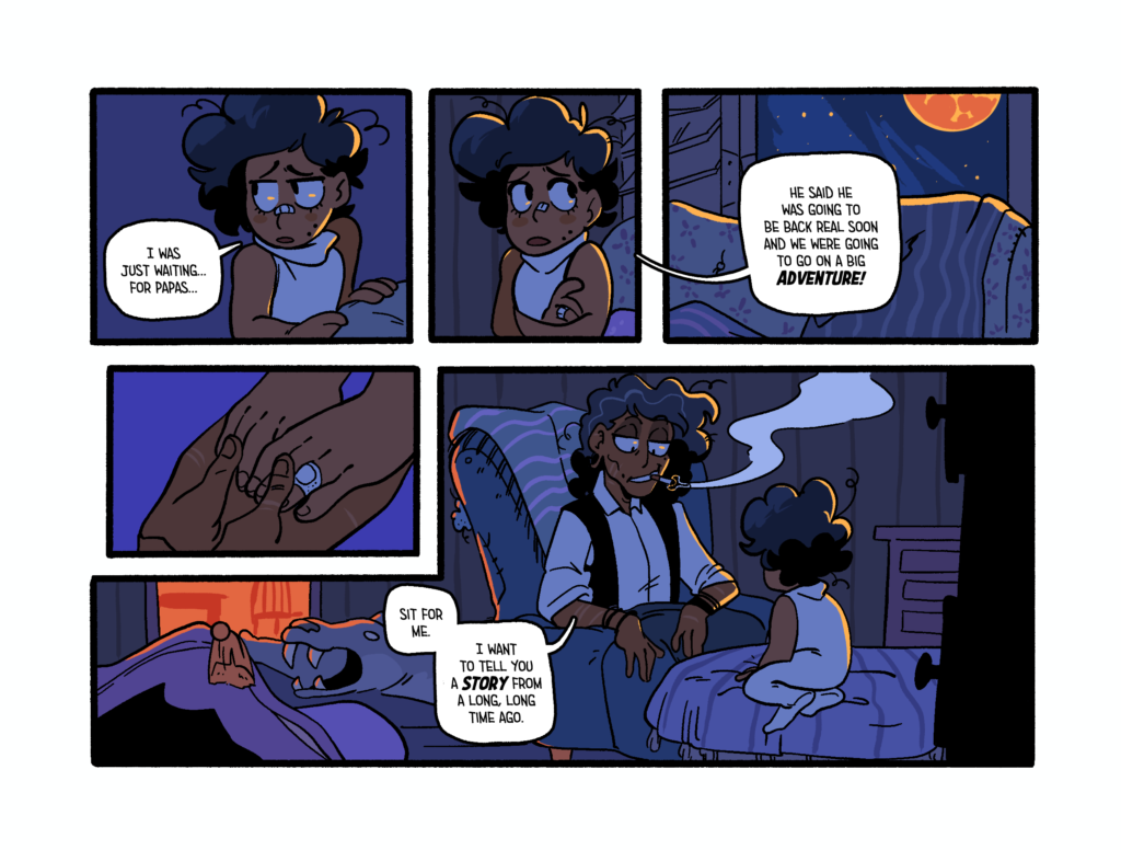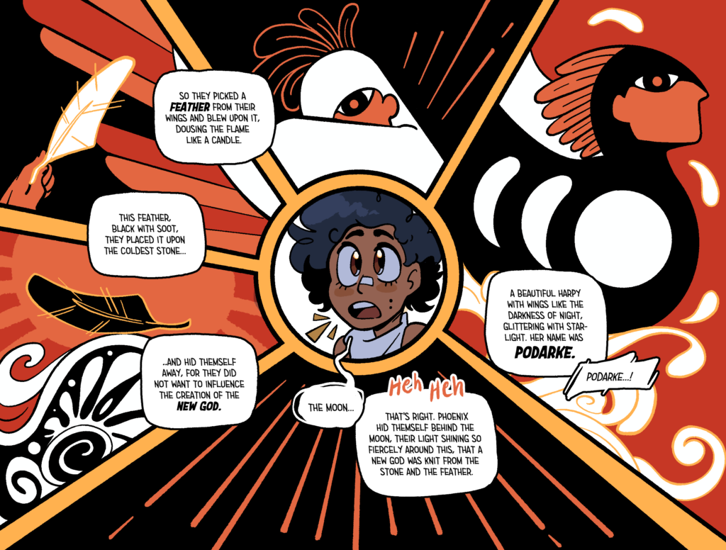 Most of my personal work on Augustine is hard to really split from Tas’. I’m responsible for brainstorming the story (a shared task with my partner), writing the physical script, thumbnailing the panel layouts, inking and the final formatting on the books. So if you want to check all of that out I’d follow one of these, here links to get even more info on this thing~
